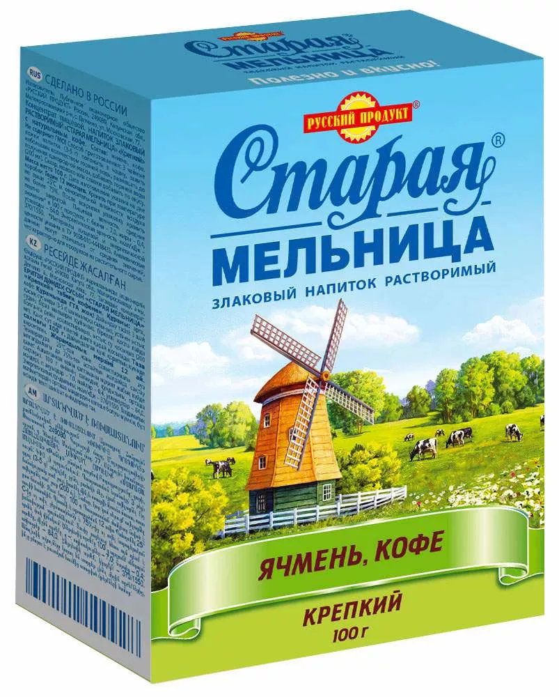 Злаковый напиток "СТАРАЯ МЕЛЬНИЦА" содержит ячмень и настоящий кофе. Имеет бодрящий вкус, подходит тем, кто хочет ограничить количество кофеина. Очень вкусно с молоком и сахаром!5 чайные ложки напитка (3-5 г) положить в чашку, залить небольшим количеством горячей воды, размешать до получения однородной массы, добавить горячей воды (200 мл). Сахар, молоко или сливки добавить по вкусу.