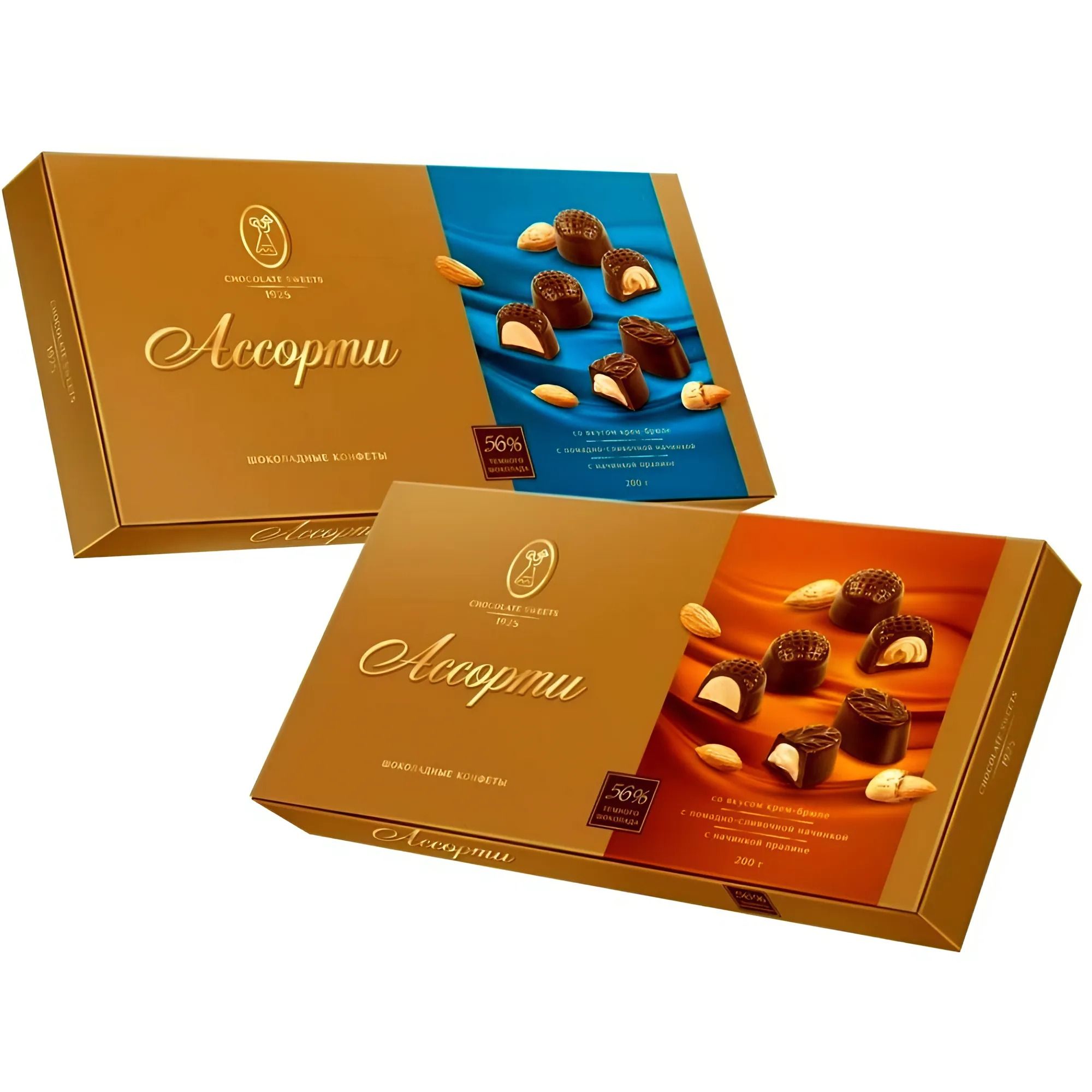 Любимый и самый популярный набор конфет «Ассорти» в новом дизайне. Современная коробка и классические вкусы: крем-брюле, помадно-сливочный, пралине в настоящем шоколаде. Это классика, проверенная временем!