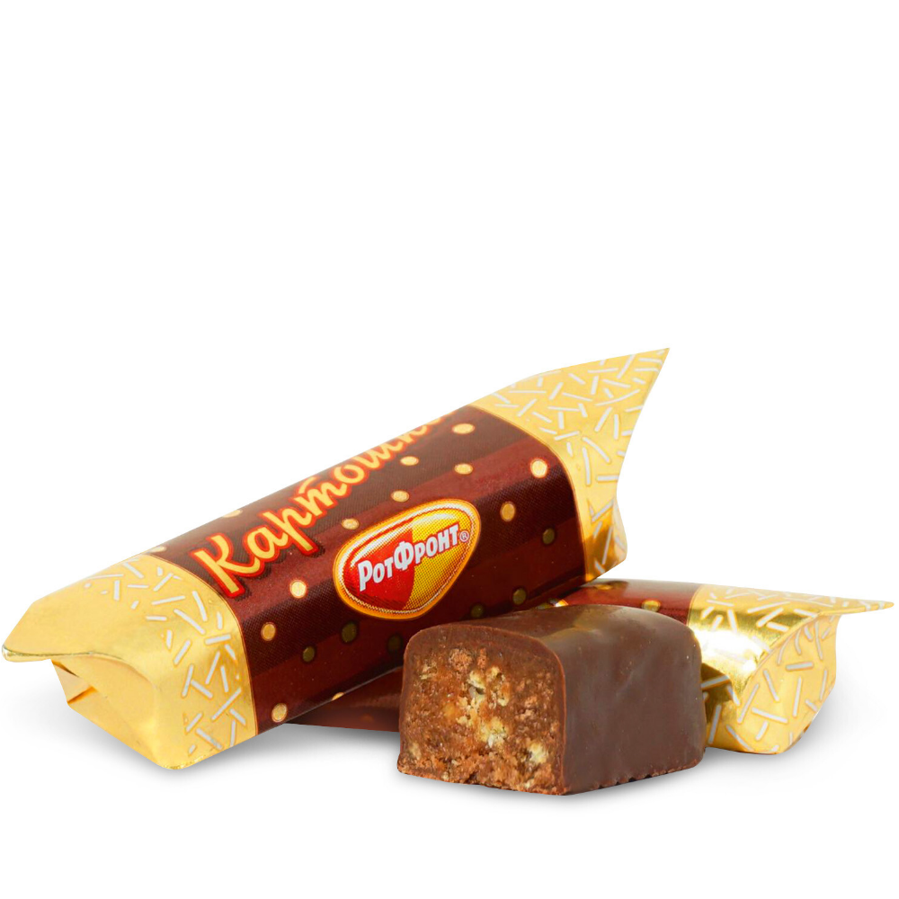 Конфеты «Картошка» от фабрики «Рот Фронт» – любимое пирожное в конфетном формате. Густая, чуть вязкая начинка с кусочками печенья и насыщенным шоколадным вкусом, покрытая ароматной шоколадной глазурью. Яркая сладость какао и печенья, мягкая, тающая текстура, конфетный размер – нежное пирожное на один укус.