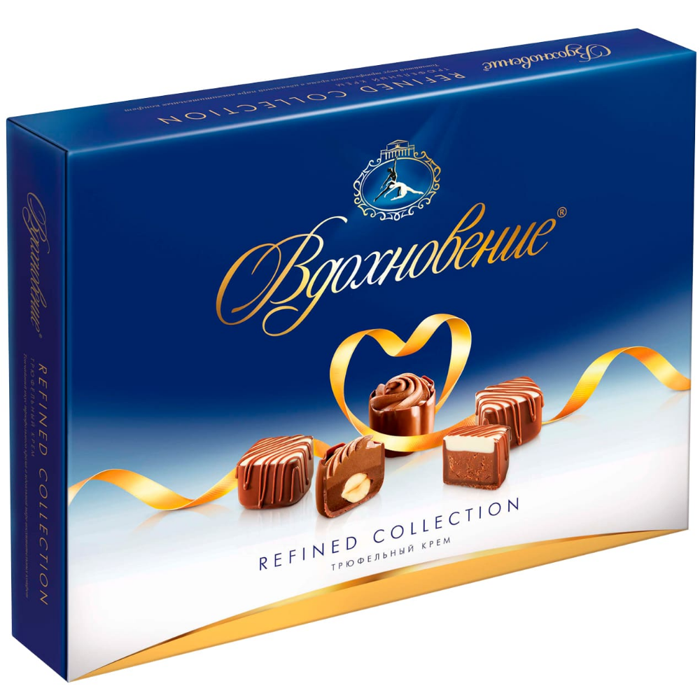Набор конфет «Вдохновение» Refined Collection трюфельный крем. Двухслойные кубики с трюфельной начинкой, покрытые узорной шоколадной глазурью и утонченные, похожие на шоколадные цветы корзиночки из глазури, наполненные нежным трюфельным кремом, скрывающим цельное ядро лесного орешка. Сладкий подарок по любому поводу.