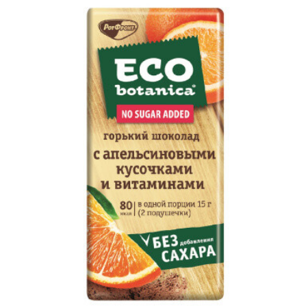 Горький шоколад Eco Botanica без сахара, с апельсиновыми кусочками – лакомство для тех, кто следит за своим здоровьем и фигурой. Сахар в этом шоколаде заменен на подсластитель изомальт, который не только не повышает уровень сахара в крови, но и стимулирует активную работу кишечника. Мягкий вкус горького шоколада «Эко Ботаника» прекрасно оттеняют ароматные апельсиновые кусочки, а его пользу дополняют входящие в состав витамины A, D и E.