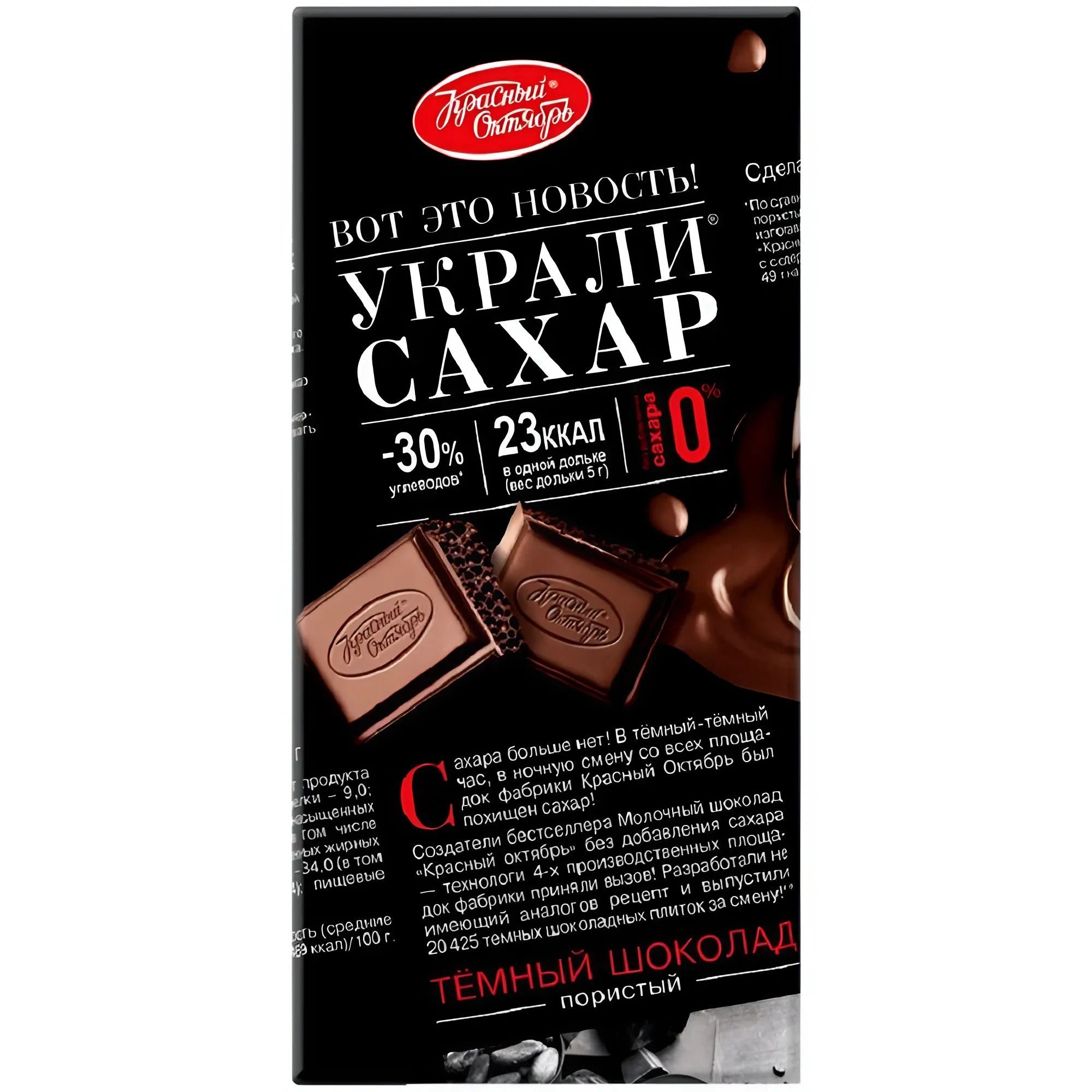 Великолепный темный пористый шоколад «Красный Октябрь» без сахара. В составе только натуральные ингредиенты, создан для ценителей темного шоколада. Без вреда для фигуры: меньше углеводов на 30%, а в одной дольке шоколада всего 23 ккал, без интенсивных подсластителей, без вреда для ЖКТ. Отличное начало дня с чашечкой кофе!