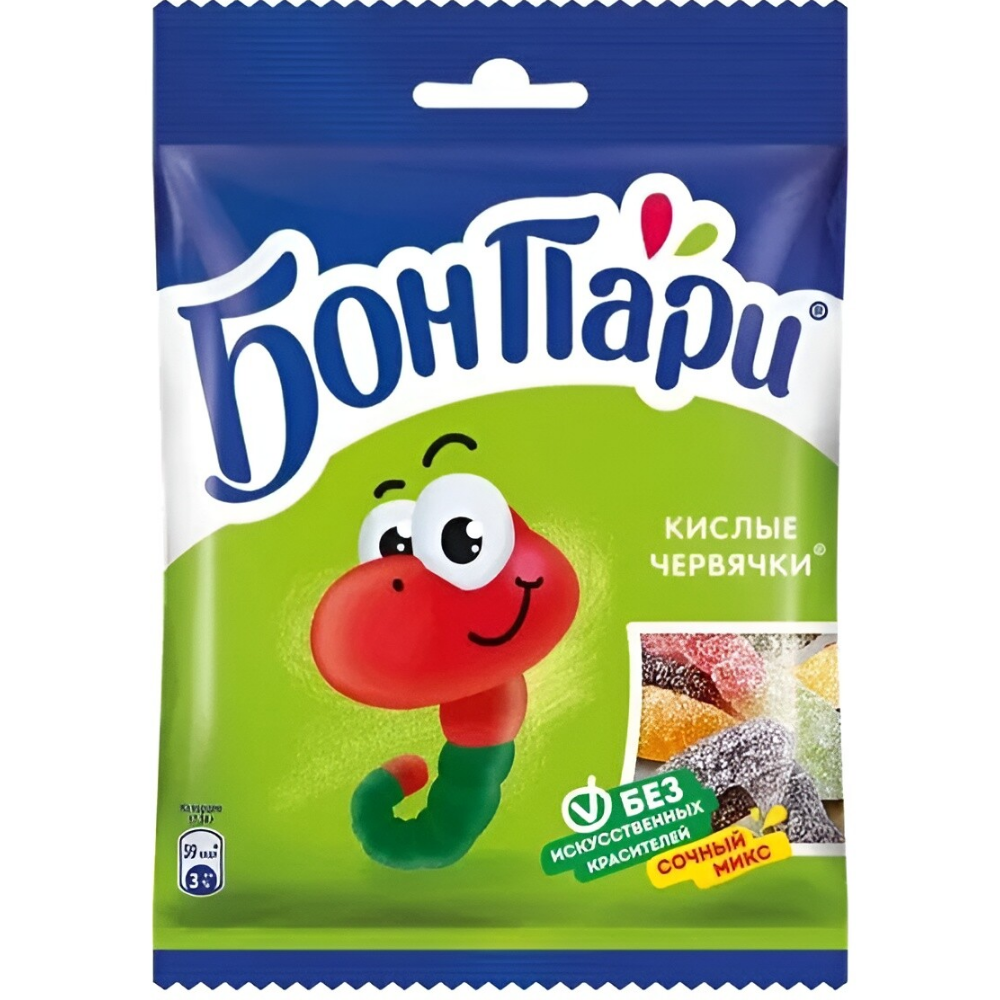 Для изготовления мармелада Бон Пари используются только природные красители, полученные из натуральных компонентов, таких как морковь, перец, шпинат. Кислый жевательный мармелад со вкусом фруктов в сахарной обсыпке - яблоко/малина и лимон/черная смородина. Веселые червячки - необычное сочетание кислого и сладких вкусов. Без искусственных красителей. Сочный микс.