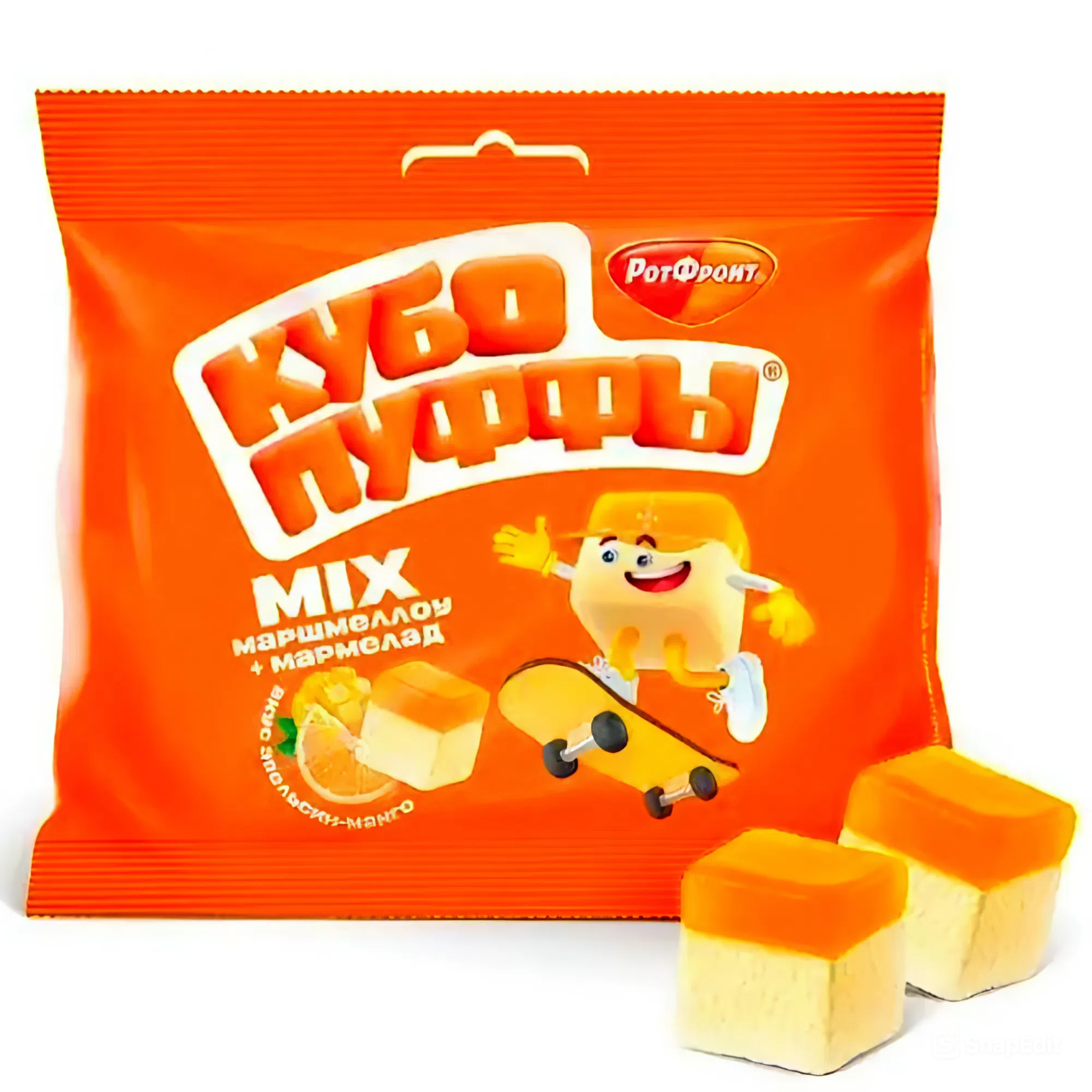 Попробуйте взрыв вкуса от Рот Фронт – Кубопуффы с сочным сочетанием апельсина и манго! Мягкие двухслойные кубики объединяют нежность маршмеллоу и яркость желейного мармелада, создавая неповторимый вкусовой дуэт.