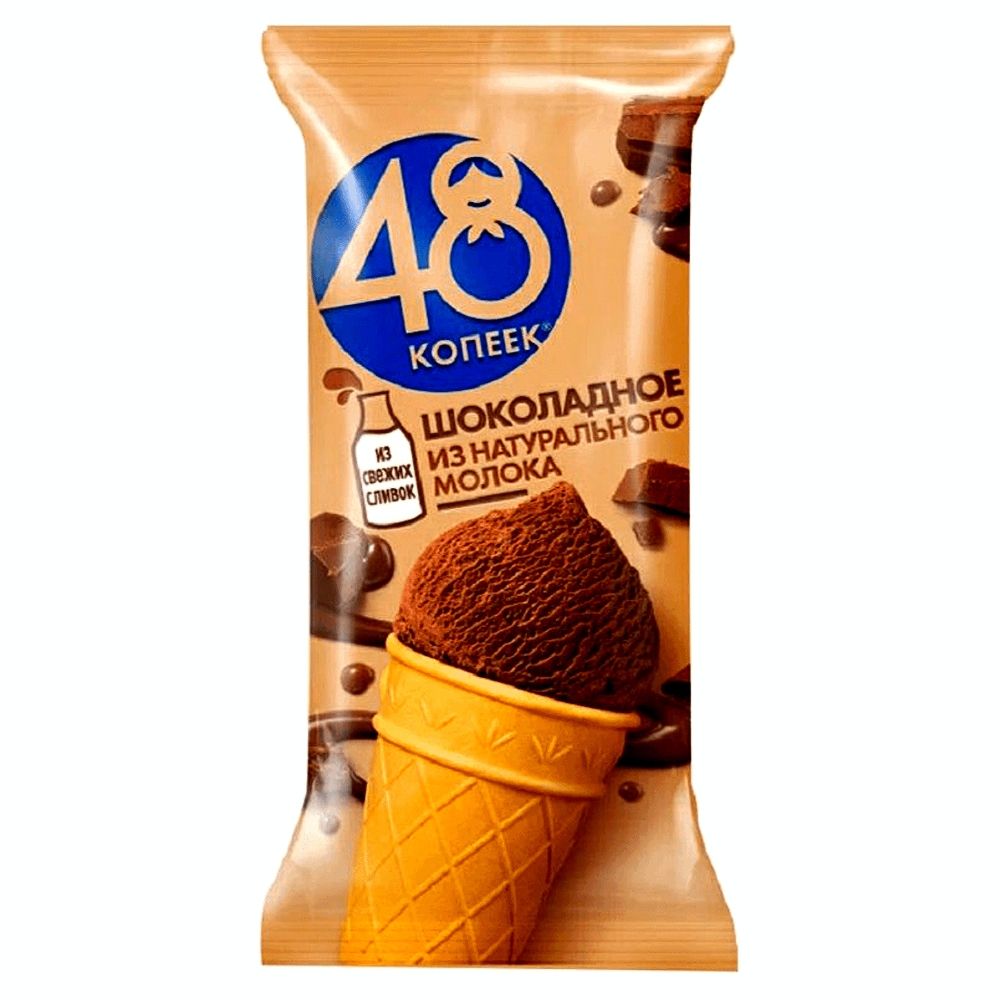 Мороженое 48 копеек шоколадное непременно порадует всех любителей шоколада. Производится на основе натуральных ингредиентов: цельного коровьего молока, свежих сливок, сливочного масла, какао-порошка. Мороженое обладает нежной, слегка маслянистой текстурой и изумительным, умеренно сладким вкусом, а шоколадный соус делает десерт еще вкуснее и аппетитнее.