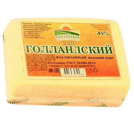 Сыр Голландский 45%, без змж – продукт натуральный, полутвердый с ароматным сырным вкусом и легкой кислинкой. Консистенция нежная, эластичная с равномерно расположенными глазками круглой овальной формы. Незаменим при приготовлении салатов.