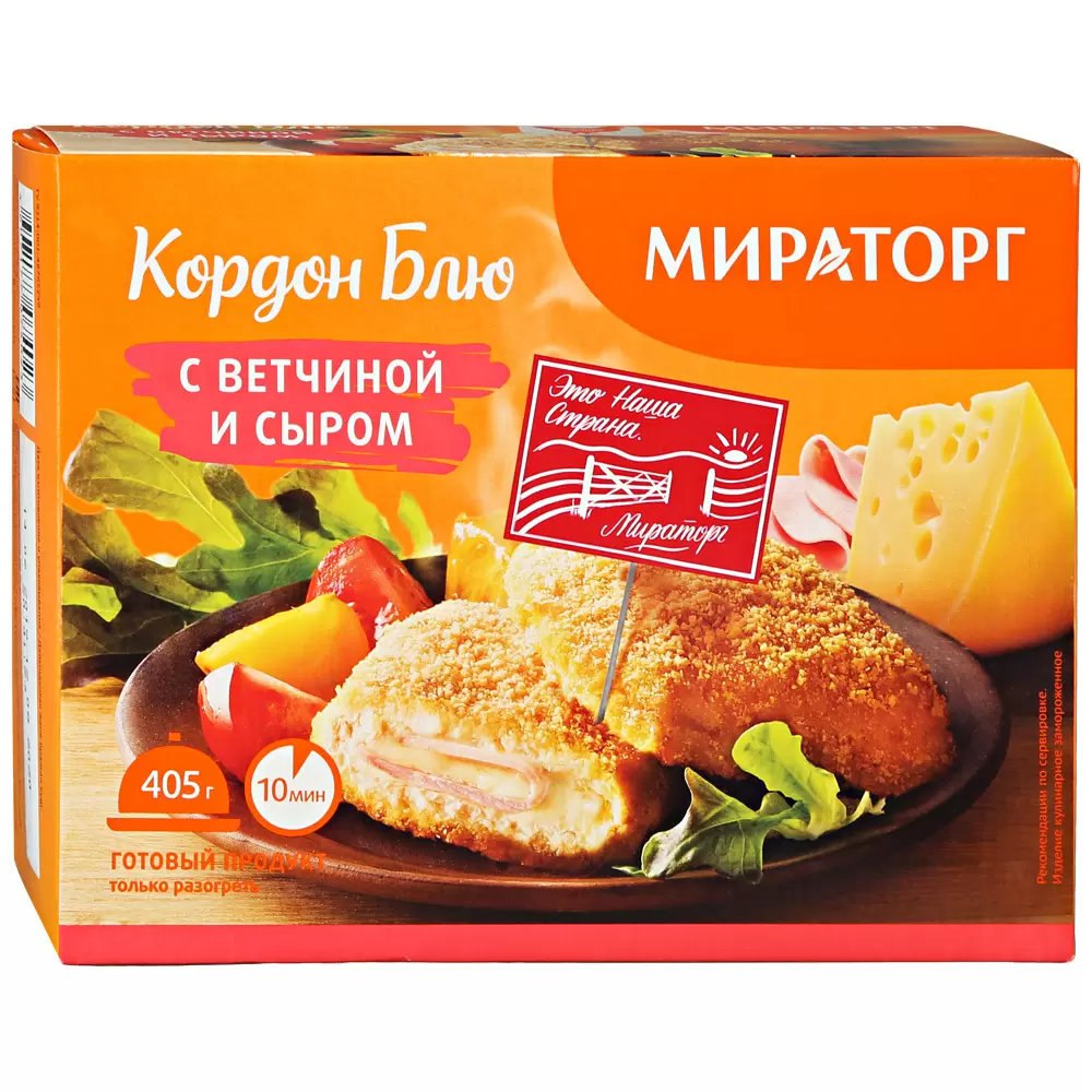 Филе грудки кур замороженное, вода питьевая, мука пшеничная, продукт плавленый с сыром [вода питьевая, заменитель молочного жира (рафинированные дезодорированные растительные масла в модифицированном переэтерифицированном виде (подсолнечное, рапсовое)) антиокислитель Е306), сыр полутвердый (молоко пастеризованное, молокосвертывающий ферментный препарат животного происхождения (сычужный фермент), уплотнитель Е509, консервант E251, мезофильные молочные культуры), концентрат молочного белка, комплексная пищевая добавка (загустители (Е1422, Е1420), эмульгатор Е452(i), эмульгирующая соль Е339(ii), агенты желирующие (Е407, Е508), фруктоза, сыворотка молочная сухая, соль поваренная пищевая, ароматизаторы пищевые, консервант сорбат калия Е202], изделие колбасное ветчинное из мяса птицы ветчина [мясо кур замороженное, вода питьевая, нитритно- посолочная смесь (соль, фиксатор окраски нитрит натрия), крахмал картофельный, специи молотые и экстракты специй (чеснок, перец черный, перец белый, перец душистый, тмин