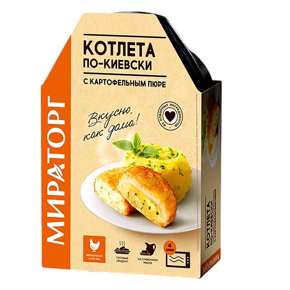 Котлета(филе грудки кур замороженное, вода питьевая, мука пшеничная, масло сливочное, масло растительное подсолнечное рафинированное дезодорированное, кожа тушки кур замороженная, крахмалы (картофельный, гороховый, тапиоковый, пшеничный), белки (соевый, молочный), соль, волокна пищевые (клетчатка пшеничная), стабилизаторы (метилцеллюлоза, моно- и диглицериды жирных кислот, гуаровая камедь), дрожжи, петрушка рубленая, регуляторы кислотности (глюконат натрия, карбонат натрия), эмульгатор Е464, антиокислитель аскорбиновая кислота, куркума, паприка, красители (экстракт паприки, аннато), сахар, ароматизаторы (содержат лактозу, антиокислитель альфа-Токоферол)), картофельное пюре (картофель свежий, молоко питьевое ультрапастеризованное м.д.ж. 3,2%, масло сливочное с м.д.ж. 82,5%, соль)