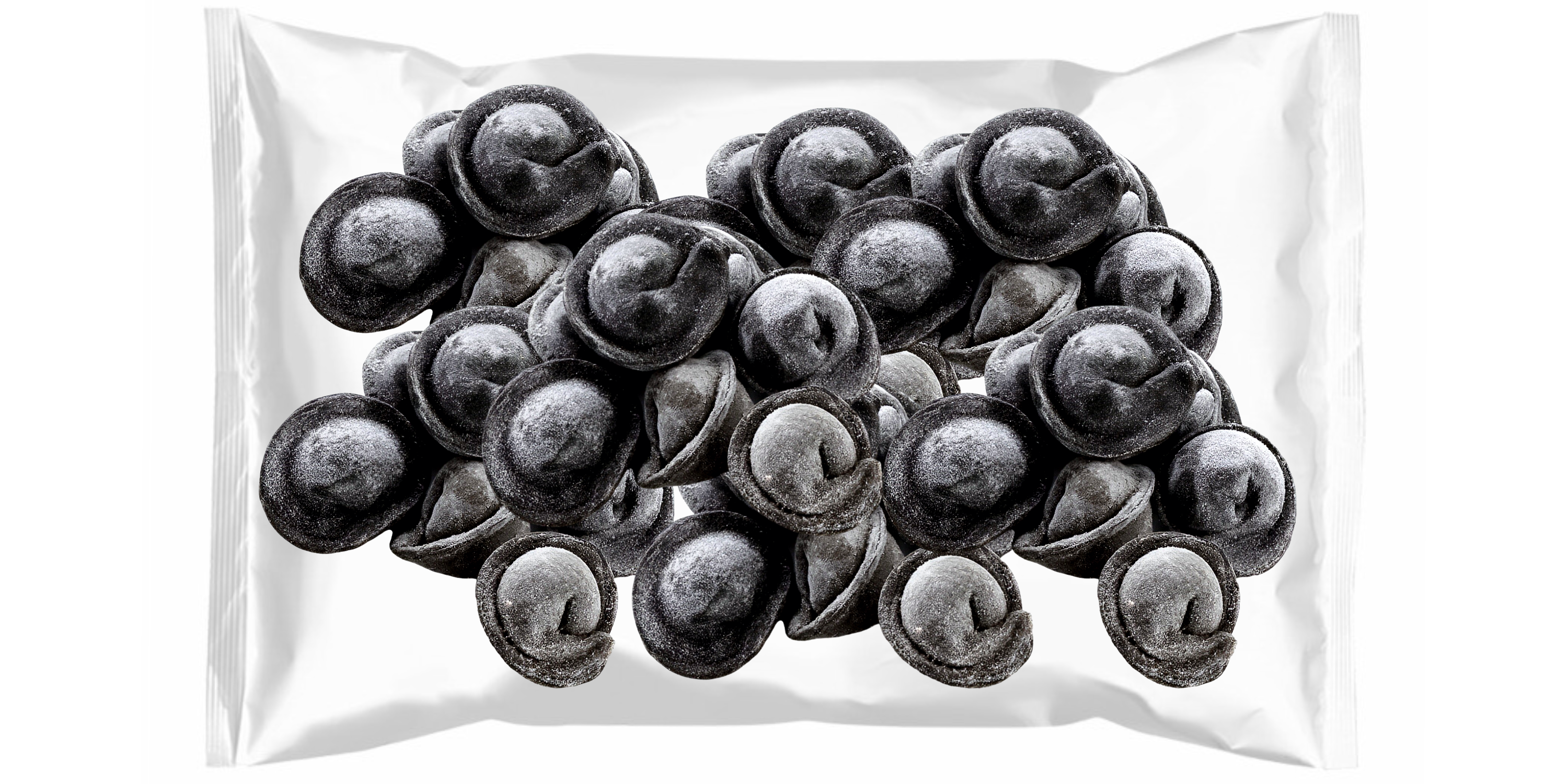 Фарш: свинина, говядина, вода питьевая, лук репчатый, соль, сахар, перец черный; Тесто: мука пшеничная в/с, вода питьевая, яичный порошок, краситель уголь растительный, масло подсолнечное, соль