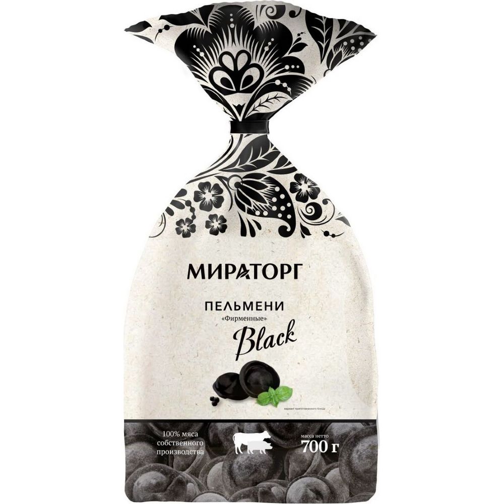 Фарш: свинина, говядина, вода питьевая, лук репчатый, соль, сахар, перец черный; Тесто: мука пшеничная в/с, вода питьевая, яичный порошок, краситель уголь растительный, масло подсолнечное, соль.