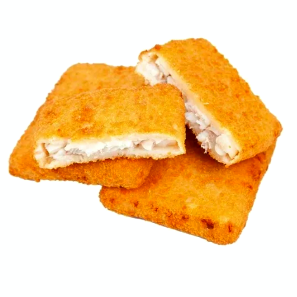 Минтай (Theragra chalcogramma) филе; панировка: сухари панировочные (мука пшеничная, крахмал пшеничный, соль, дрожжи хлебопекарные, эмульгаторы (моно- и диглицериды жирных кислот, эфиры глицерина и диацетилвинной и жирных кислот), куркума, ароматизатор), стабилизаторы (крахмал ацетилированный, дикрахмаладипат ацетилированный, дикрахмалфосфат), мука (пшеничная, кукурузная, рисовая), соль, разрыхлители (дигидропирофосфат натрия, гидрокарбонат натрия), чеснок, загустители (гуаровая камедь, ксантановая камедь), усилитель вкуса и аромата глутамат натрия 1-замещённый, крупа манная, растительный белок (пшеница); вода; масло растительное; петрушка сушеная; соль. Возможно наличие следов яиц, сои, молока, сельдерея, горчицы и продуктов из них, диоксида серы и сульфитов. Произведено из мороженого сырья.